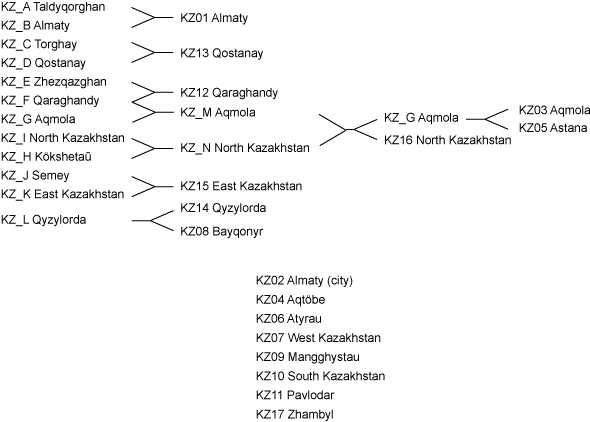 Kazakhstan: Version 400 has a single code KZ for the country, and version 401 introduces codes for the 14 oblasts and 3 cities as they exist in 2000. Using the history described at http://www.statoids.com/ukz.html, we can recreate the lineage from the 19 oblasts and 1 city as they existed at the time Kazakhstan became independent. We have assigned virtual FIPS 10 codes to the entities, and use the statoid names: