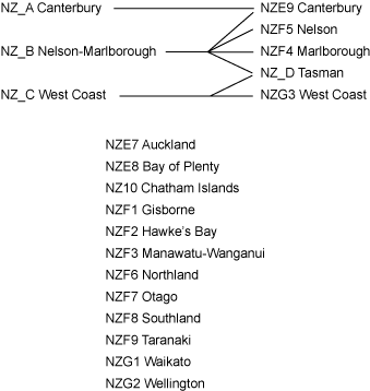 New Zealand: versions before 410 correspond to the organization before 1989, in 22 local government regions. In 1989, New Zealand reorganized in 14 regional concils. A further adjustment occurred in 1992, and FIPS version 410 captures the result of that further adjustment, except that it does not include a code for the newly formed Tasman region. Here is a picture starting from the 1989 situtation, with virtual codes: