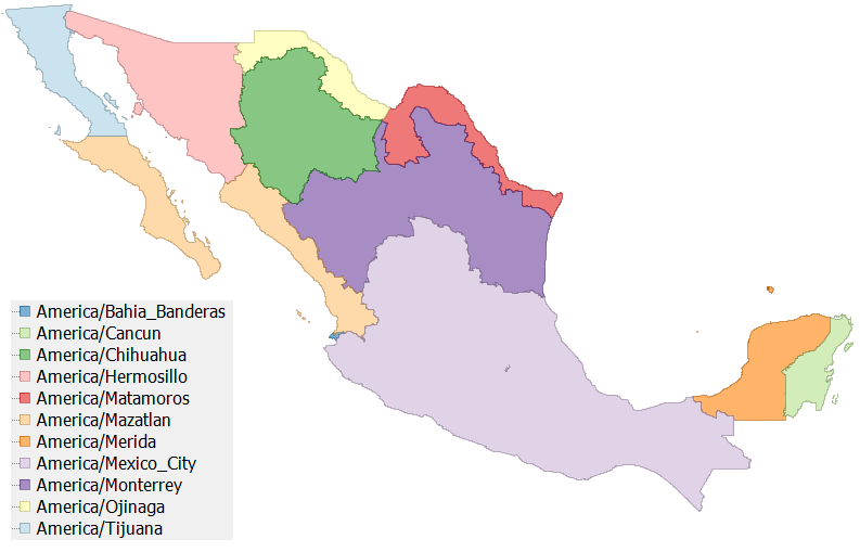 The tz_mexico shapefile (zip, sha1) captures the TZ timezones of Mexico.